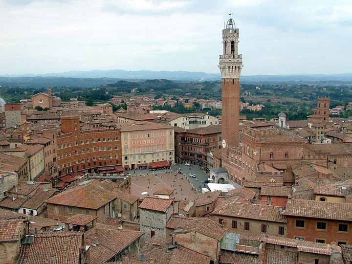 Начните свою прогулку по Сиене у ворот Святого Марка (XIV в), пройдите по знаменитому кварталу Ла Кьоччола (Улитка) и главной улице города Виа делла Читта, полюбуйтесь Кастель Веккьо — Старым замком (VII в), Кафедральным собором Дуомо, Баптистерием и Лоджией делла Мерканция (Торговой) и, конечно, Пьяцца дель Кампо — центральной площадью Сиены. Самое значительное здание на площади -грандиозный дворец Палаццо Публико с башней Торре-дель-Манджа. Именно в этом дворце (XII-XVI вв.) располагалась резиденция королей.