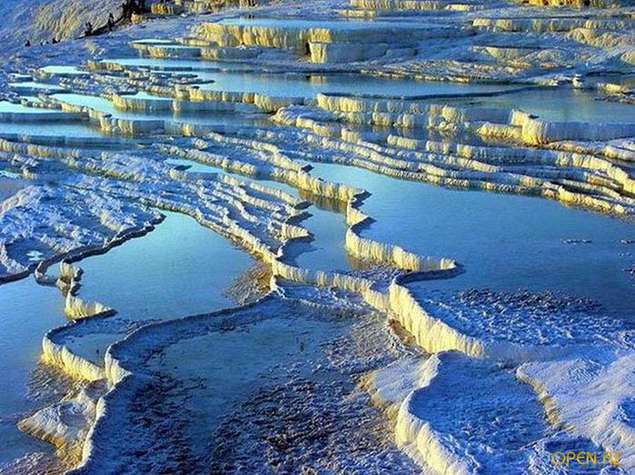 Комплекс Памуккале представляет собой 17 геотермальных источников с температурой воды от 35 до 100 градусов и водоемы-террасы, естественным образом образовавшиеся из травертина.